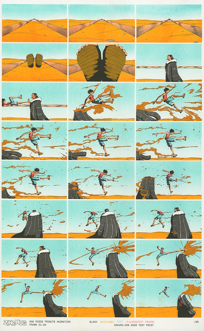 On that note, we’re planning to celebrate 10 years of Zine Hug with some special releases later in the Fall. Until then, come check us out at a show (gearing up for SABF this weekend!) or join us for the One Piece Animation livestream!